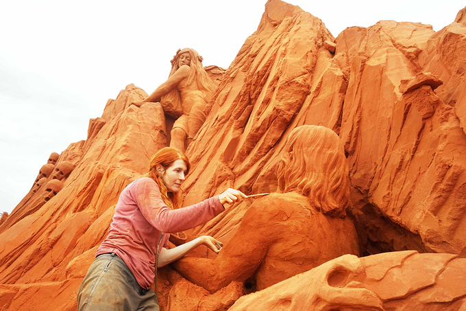 На фото можно видеть, как трудится над своей работой Мариэль Хиссельс, приехавшая прямиком из Нидерландов. Её работа называется «Персефона». Мариэль является профессиональным песчаным скульптором. В этот чудесный парк были приглашены художники из 15 стран, в том числе Италия, Бразилия, CША и Япония.