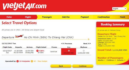 2) Эконом (ручная кладь до 7кг) - Хошимин - Чиангмай = 1 115 000 VND (50$)